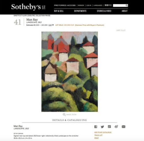 - 昨日、パリのサザビーズに出品されたマン・レイの油彩『風景』(1913年)の結果が判った。予想価格80,000-120,000EURに対して、手数料込みで100,000EUR(邦貨換算約1,300万円)。キュービスム風の作品でポール・エリュアール旧蔵、1959年からの重要な展覧会に…