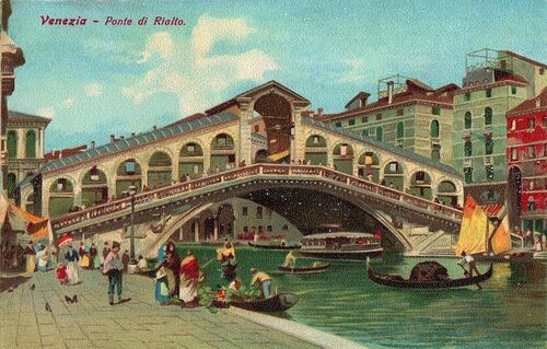 9 × 14.1 cm [メモ] リアルト橋は13世紀、運河に最初に架けられた木製の跳ね橋。16世紀に大理石の橋に架け替えられている。この辺りは海抜が高くヴェネツィアで最初に人が住み始めた地区だという。