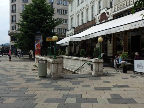 カフェ・ジェルボー前に地下鉄1号線始発駅・ウルシュマルティ広場入口。降りると楽しい地下世界。同線はロンドン、イスタンブールに次ぐ世界で三番目となる1896年開業。電気運転としては世界初であり、当初路線3.7キロ、地表近くを走る。2002年世界遺産とな…