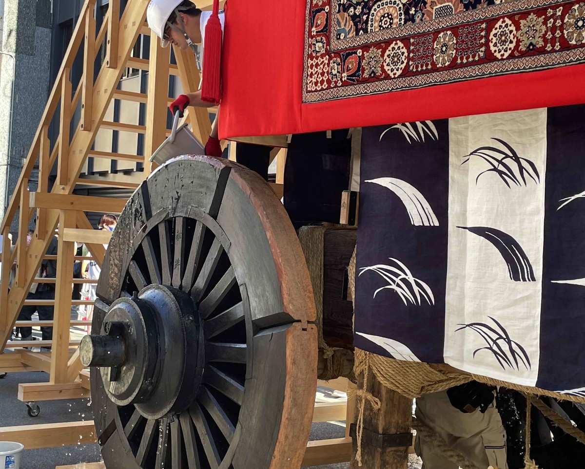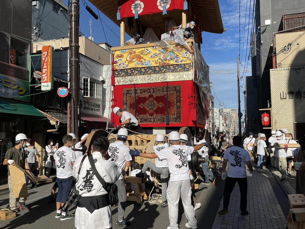 曳手の皆さんから、カメラウーマンが笑わせ上手くパチリ。ひとつの山鉾巡行にどれだけの人がたずさわるのか、山鉾建てでは作事三方といわれ、(1)手伝方: 基礎構造、胴組組み立て、(2)大工方: 鉾屋根、囃子台組み立て、(3)車方: 車輪取付。巡行では町内の役員を筆頭に、音頭取り、囃子方、屋根方、曳手などなど。関係者はおよそ200人。パチリの皆さんを拝見しながら、笑顔はよろしいなと、思いました。196年ぶり復活です。