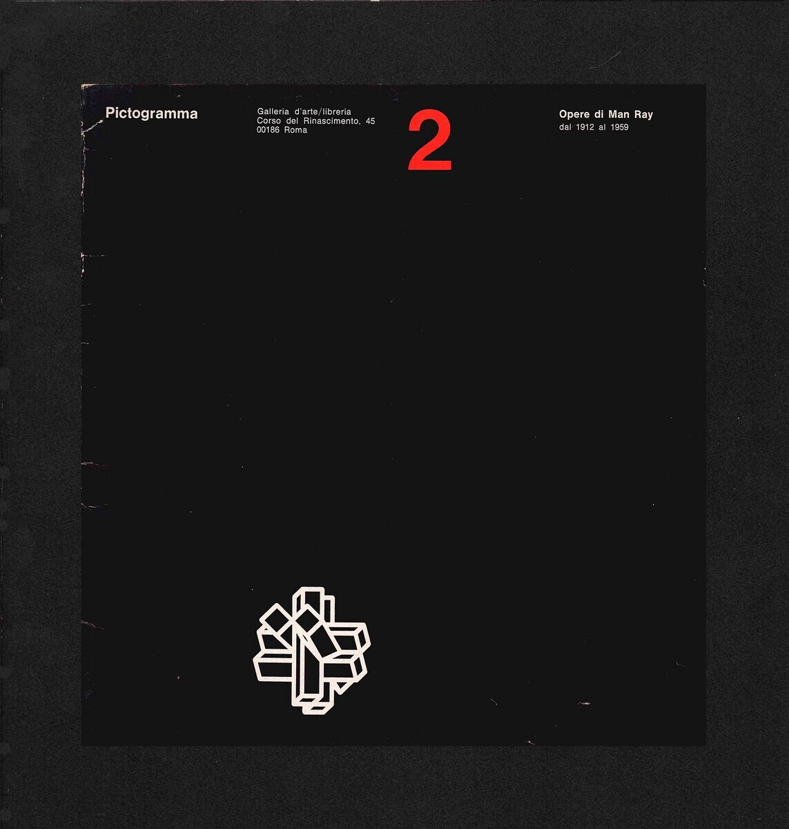 Galleria d’Arte / Libreria Pictogramma. Opere di Man Ray dal 1912 al 1959. April 1972. Catalogue, List of some works: 68 drawings, watercolors, objects, rayographis, prints, documents, and books. Texts by Paul Eluard (Appunti sui disegni di Man Ray, 1936 and Préface pour Les Mains Libres, 1937), Man Ray (Quello che sono, 1959), Francis Picabia (Mio caro Man Ray …, 1931), Jean Arp, Louis Aragon, and Max Ernst. With cronologia and bibliografia.