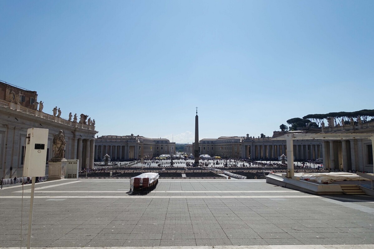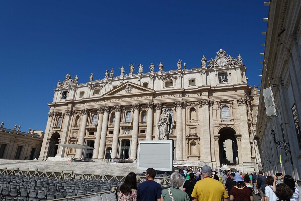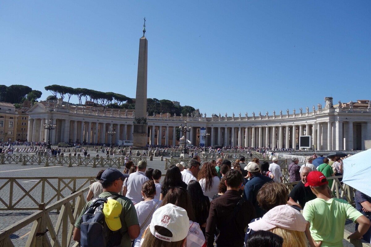 広場(ジャン・ロレンツォ・ベルニーニ設計、1656年〜1667年建設)は重なり合う正円から造られた楕円形で、オベリスクと噴水の中間に柱廊の4列ある円柱が1列に見える場所がある。ベルニーニポイントと呼ぶその場所に立って確認。ガイド氏に記念のパチリをお願いした。大聖堂までの柱廊に沿った行列は凄まじく朝一番の我々で1時間、日陰がないので午後に入場しようとすると大変と聞く。割り込もうとする人も多く、スリにも注意しなくちゃならないので、ひと仕事。