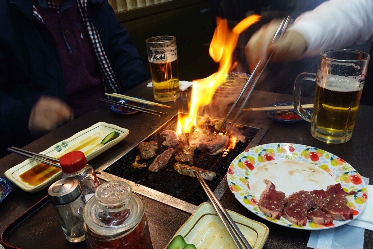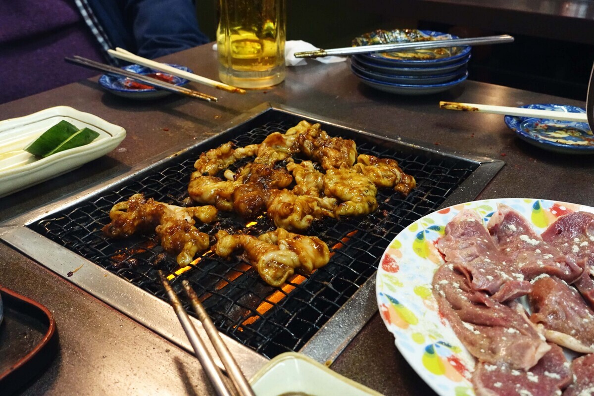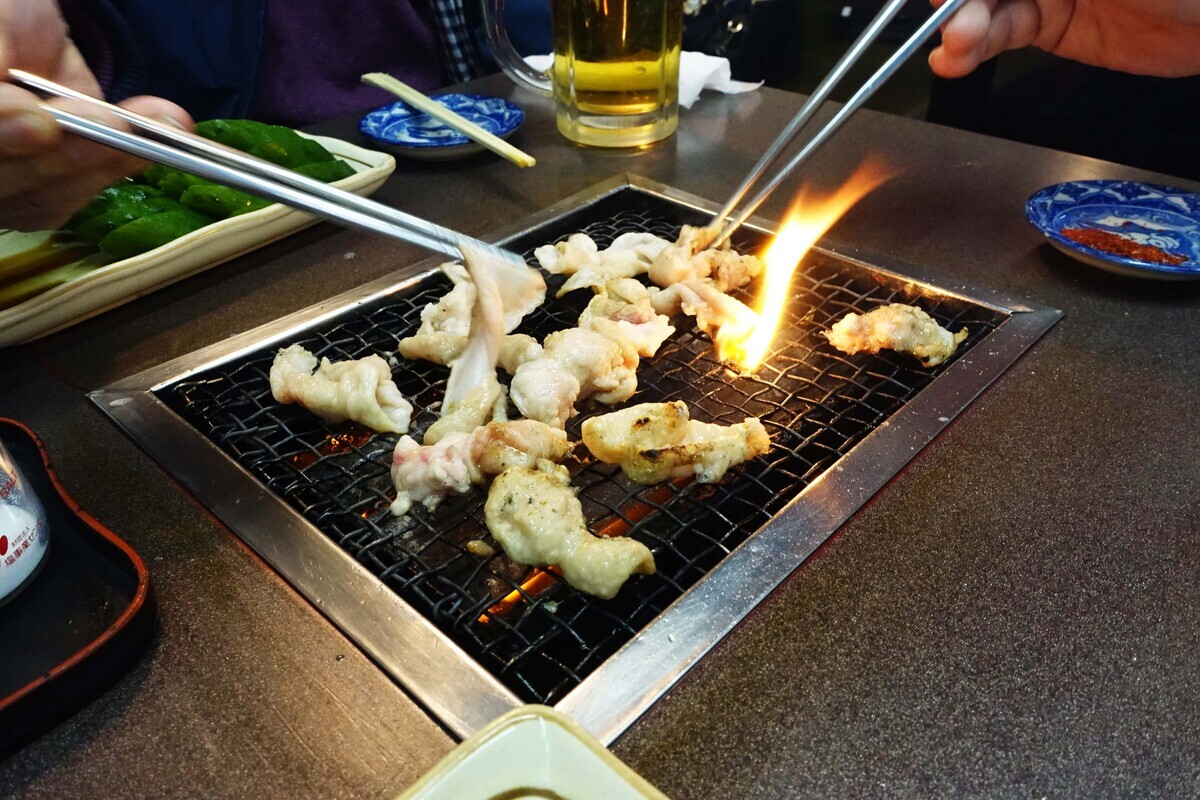メニューはとんちゃん、なんこつ、心臓、きも、子袋、みの、タン、カルビ、サガリ、キュウリなど。名古屋人には自慢秘伝の味噌味とんちゃんがグーですね。ここは、タレではなくて唐辛子で食べさせる。壁には「唐辛子は小皿にのせつけて食べてください。網の上にかけないで下さい」とある。煙の方向で目が痛い。