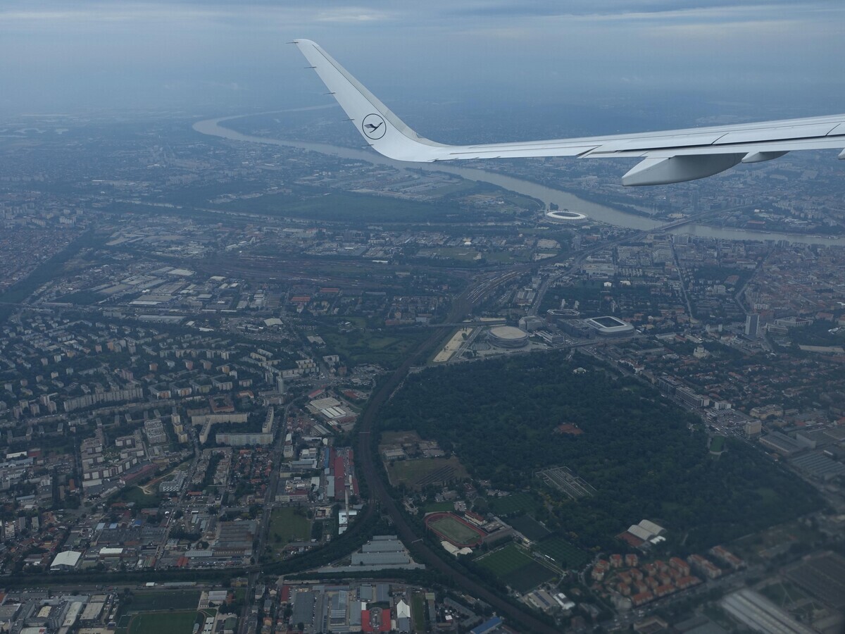 2024-09-10 ブダペスト離陸 ── 11日(火) 中欧でブラパチ エアバスA321-neo 09:49 離陸 09:52 ドナウ川とブダペストの街を下方に北西をめざす。手前クルパナ・アリーナ、ラーコーツィ橋の南に国立競技場。 10:37 フランクフルトへは凡そ1時間45分