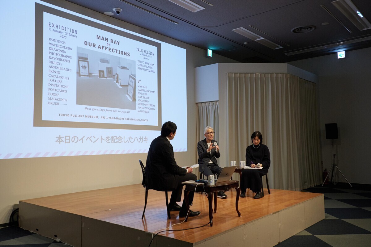 トークセッションのスライドでは、最初にアテネ画廊で頂戴した『マン・レイ カラーエッチング』展の案内状を映してもらった。小生が展覧会のエフェメラから同時代に生きている臨場感を味わい、マン・レイにのめり込んだ原点。1975年6月時点で作者は存命だったんです。年末にはファンレターを出しましたね。