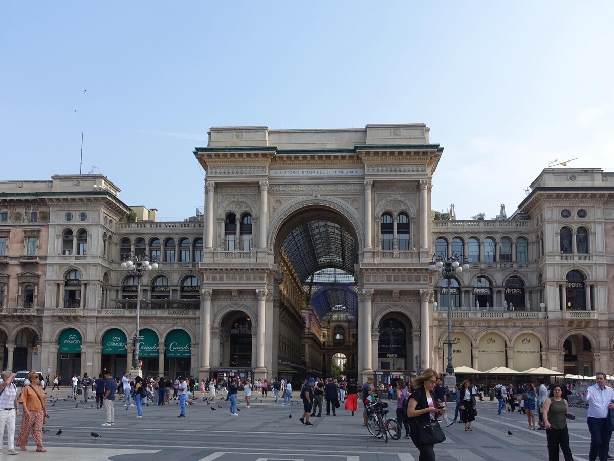 上掲は、ミラノ・ドゥオーモ広場に面して建つショッピングアーケード「ガレリア・ヴィットリオ・エマヌエーレ2世」の入り口。手前の広場側には大聖堂とともにヴィットリオ・エマヌエーレ2世を記念する騎馬像(エルコレ・ローザ作、1896年)が建てられている。